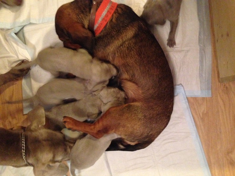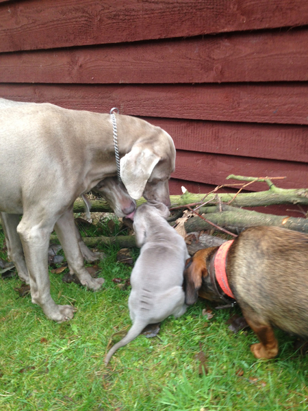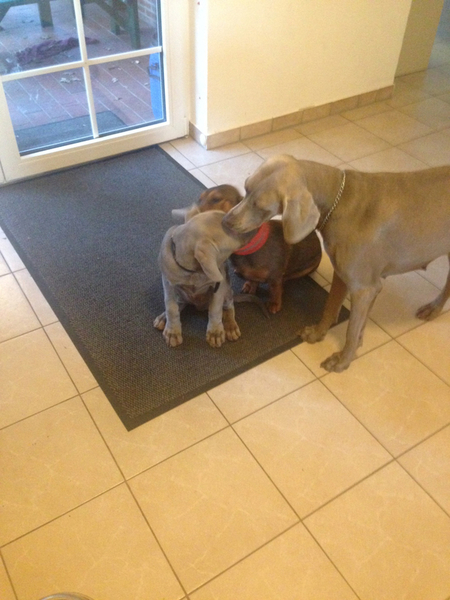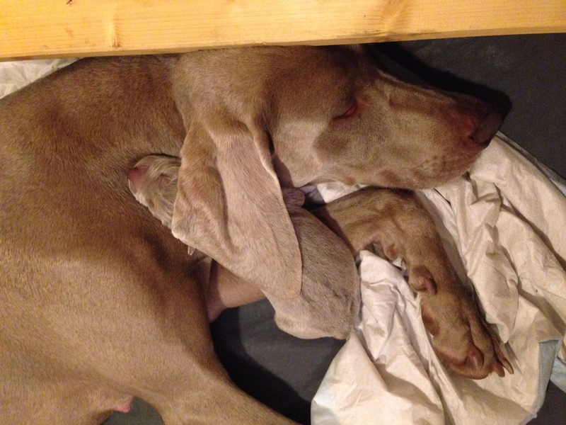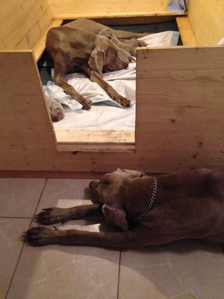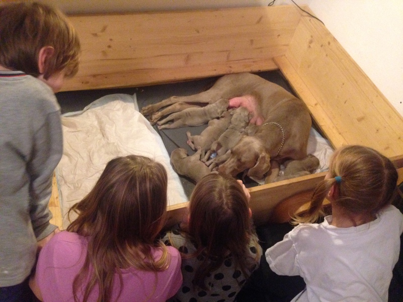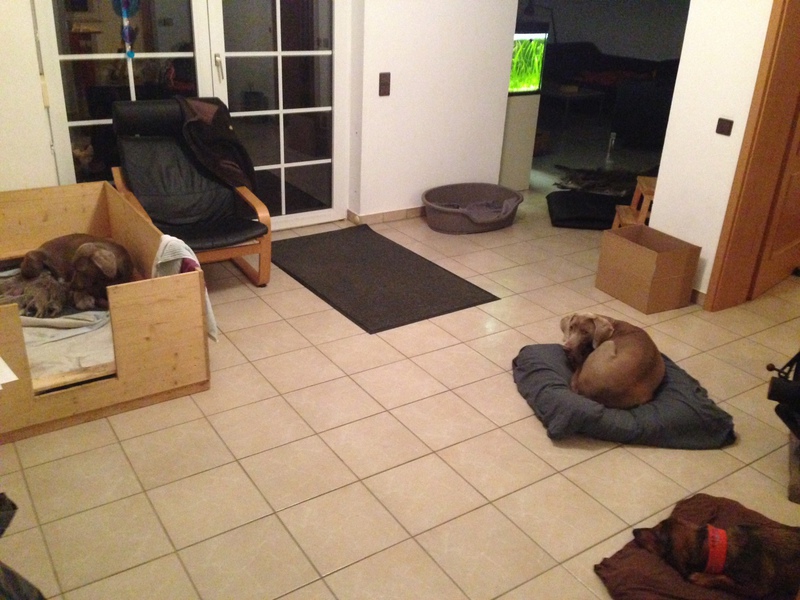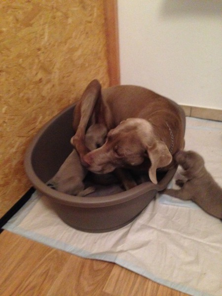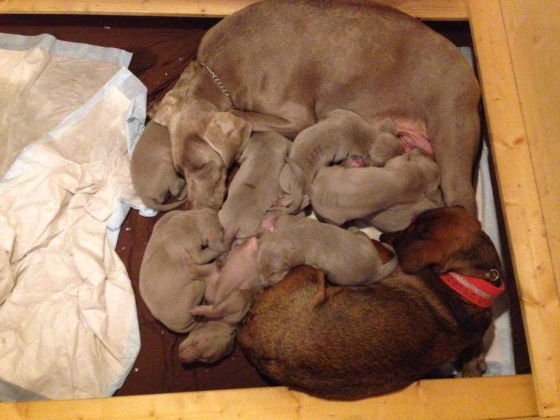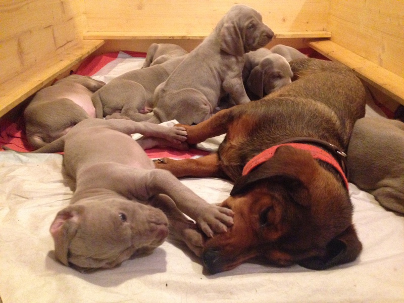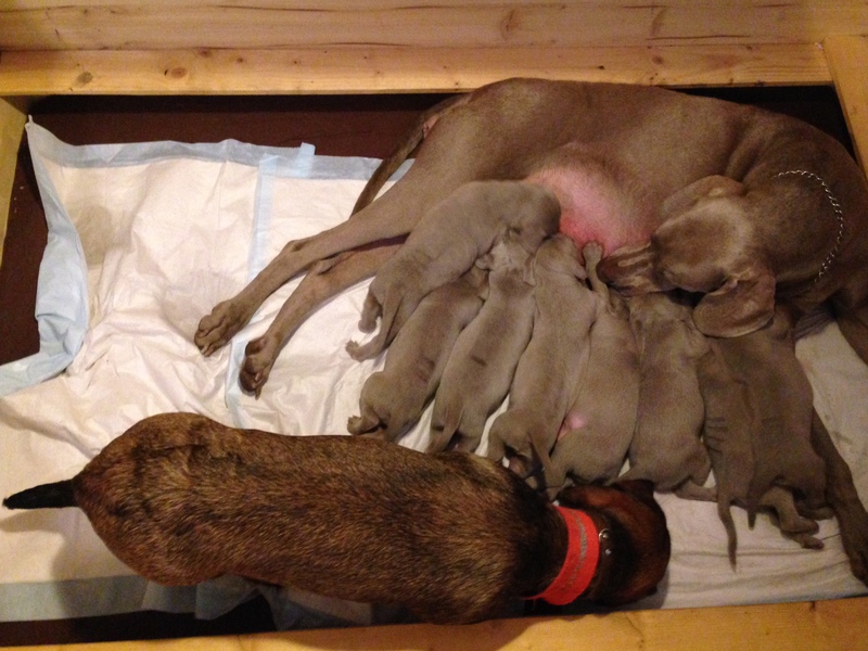 17.01. Aska hat eine fiese Gesäugeentzündung und leidet. Bärbel hat das Kommando in der Kiste übernommen und entlastet Mama. Putzen, spielen und schmusen organisiert jetzt die junge Bracke. Oma Lilli greift nur ein wenn es nötig ist. Ich bin sehr beeindruckt von diesen Instinkten.