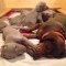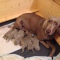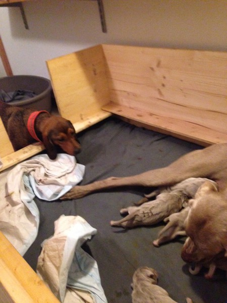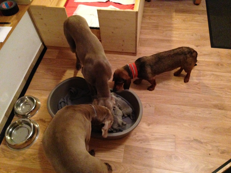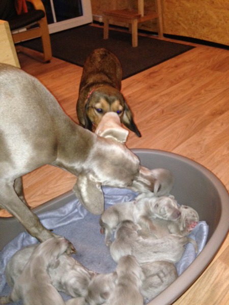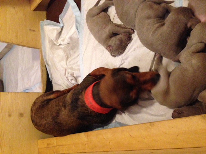 05.01. Meine kühnsten Hoffnungen erfüllen sich! Aska, Lilli und Bärbel kümmern sich gemeinsam um den Wurf. Nach fast 3 Wochen dürfen Oma und Tante in die Wurfkiste und putzen und spielen.