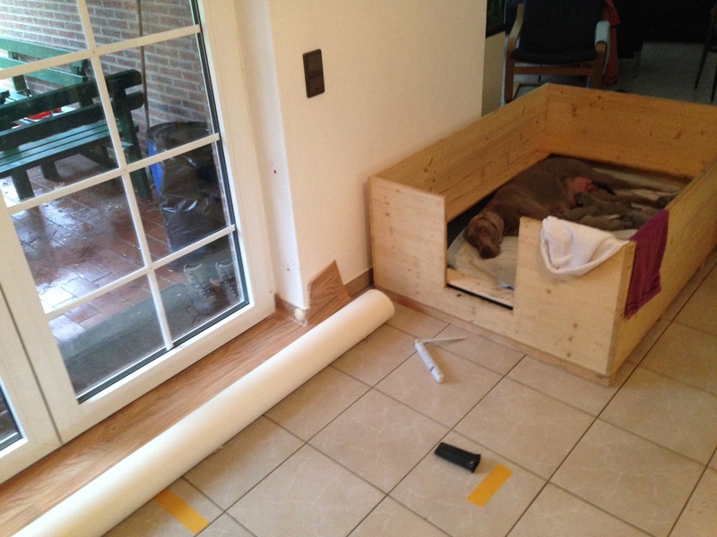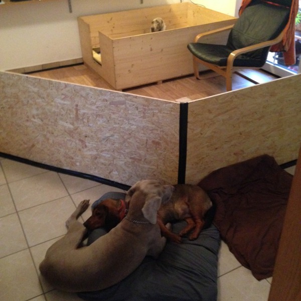 19.12. Oma Lilli und Klein-Bärbel sind beleidigt. Ihre ständigen Kontrollen der Wurfkiste haben Aska genervt. Ehe es kracht haben wir den Auslauf schon heute aufgebaut und können sie aussperren.