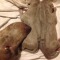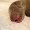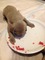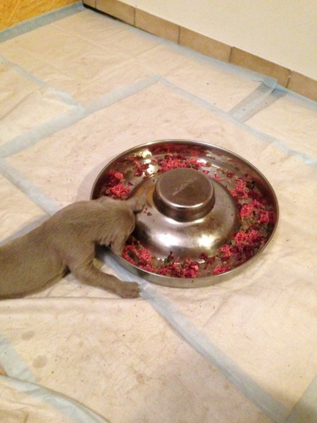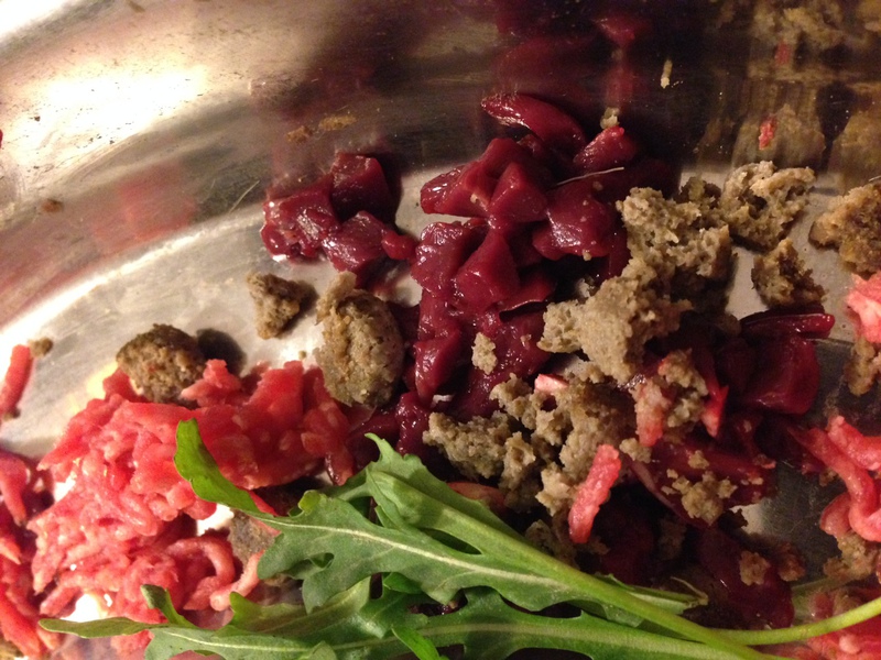 04.01. Erstes festes Futter. Serviert wurde Rinderhack. Schmeckt lecker und klebt toll.